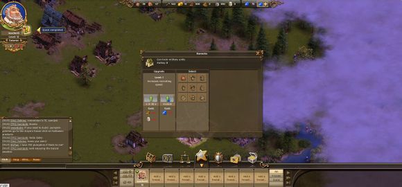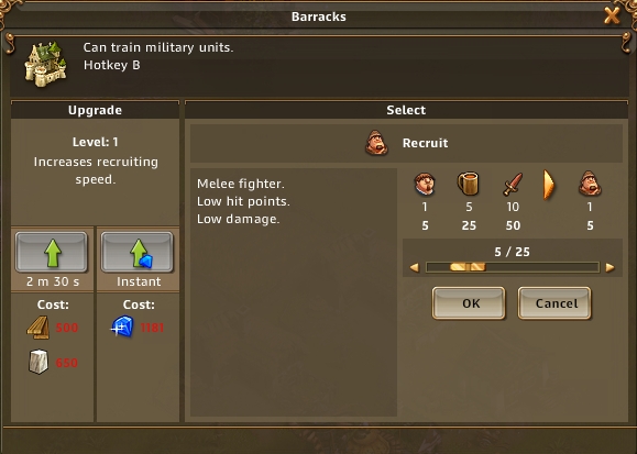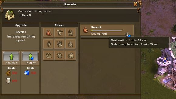 新任务,左键点击兵营。点击之后你会打开兵营菜单,左边表示兵营升级需要的材料,升级可以加快部队的生产,右边是可以招募的部队。现在只有最低等的动员兵可以招募。