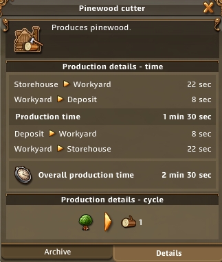 建筑的生产细节。这个伐木场基础生产时间1分30秒。从仓库到建筑物需要22秒,从建筑物到工作地点需要8秒,来回需要1分钟。合计2分30秒完成一次工作。下方是该建筑一次生产的消耗与产出:一次从松木林砍下一块木头。