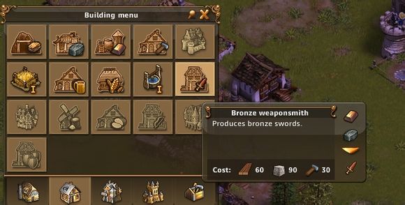 建筑好之后我们到了14级。接受新的任务:武器,为我们的动员兵准备铜剑。先建筑一个铜剑厂。铜剑是一样重要的物资。基本上它会陪伴你到满级的。值得注意的是它消耗的是铜锭和煤。意味着会与工具抢原料。