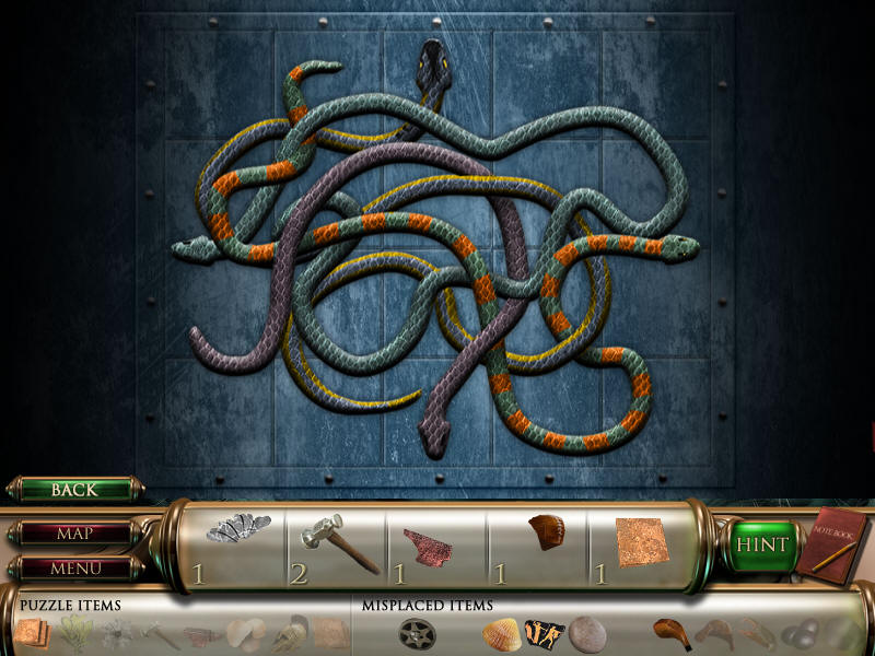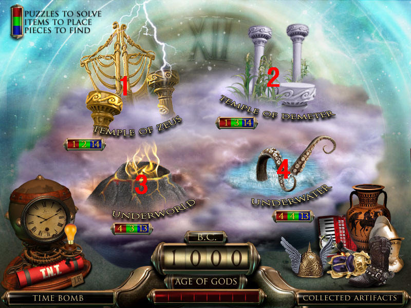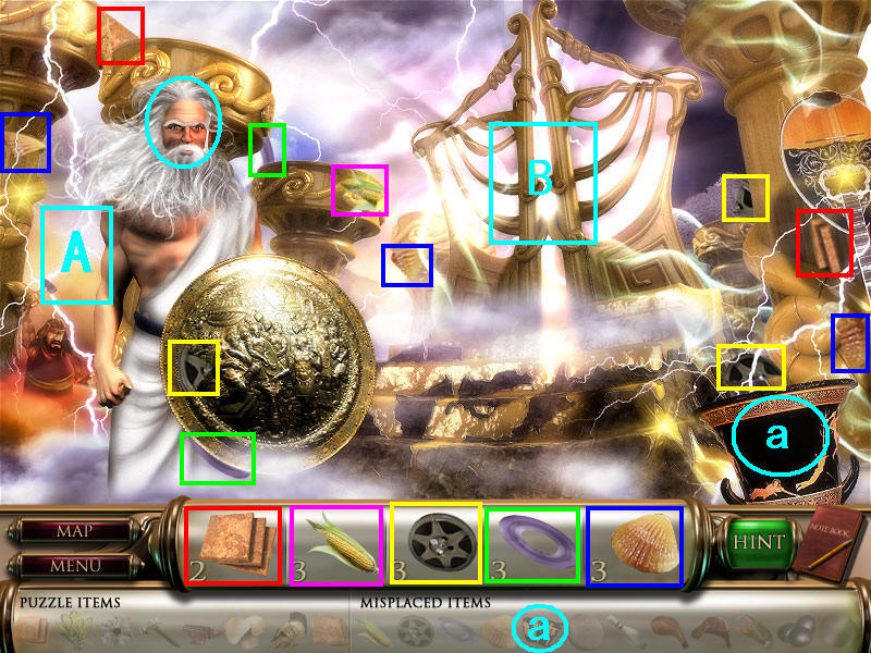 最后到场景一,人物雕像放在右边花瓶上,去独眼巨人那里,皮帽子给左边的巨人,把最后得到的打铁用的砧角给右边的独眼巨人,本以为就结束了呢,可是回到场景一宙斯那里,从天门进去,最后一个小游戏啦,这个原理很简单,就是你玩过的八大关,每关都获得时间机器的零件和不属于这个时代的物品,分别在大地图的左下角和右下角表示。而右下角的物品,就是小游戏中需要排列年代的物品。完成图如下:图8.5