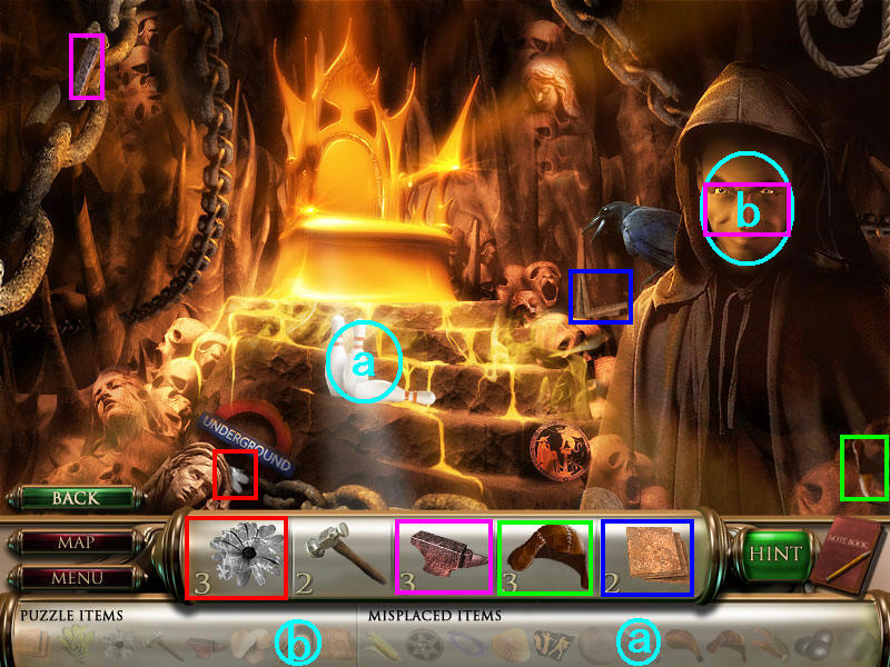 在巨人图上找齐物品2、4,这样这个场景所有物品都找齐,只剩下机关了,然后去场景二。(道具a皮帽子在场景三获得,而道具b是打铁用的砧角,在最后完成其他所有场景才能获得。)图8.11