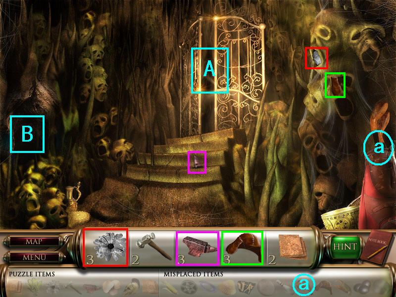 在这个图上找齐物品1、3、5,然后通过A处去下个地图,独眼巨人处。(道具a人物的雕像在场景二获得,放在花瓶的空缺处。A处通往独眼巨人处,而B处将在完成所有场景后开启最后的迷题。)图8.1
