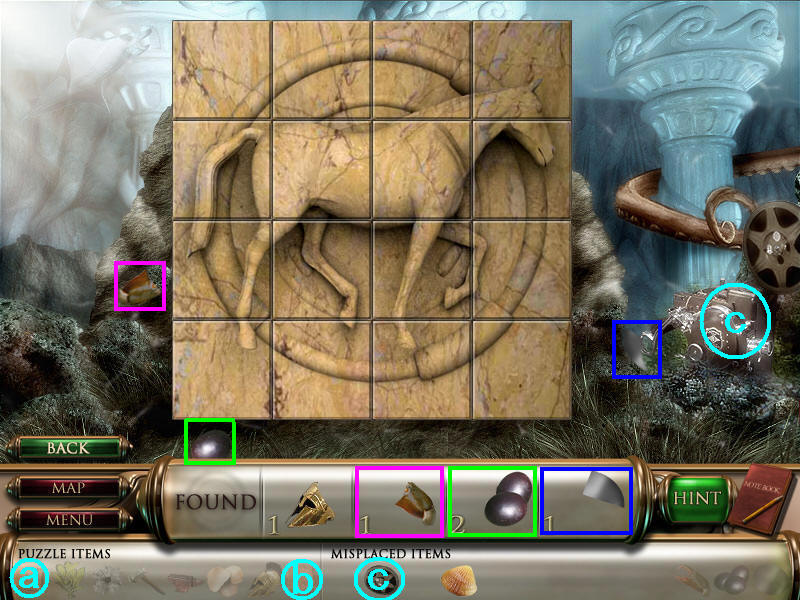 来到场景四把药草给章鱼,它就睡着了,先去左边A处的通道。把道具中两个一样的石板都放在中间的机关处,就出现了拼图。另外找到物品碎片,并把电影胶片放在右边,开始拼图,拼图有点难,不过就是一匹马外面有一个圆形的圈,完成图如下:(道具a和b两个石板分别在场景一和三已经获得;c电影胶片在场景一已经获得。)图8.41