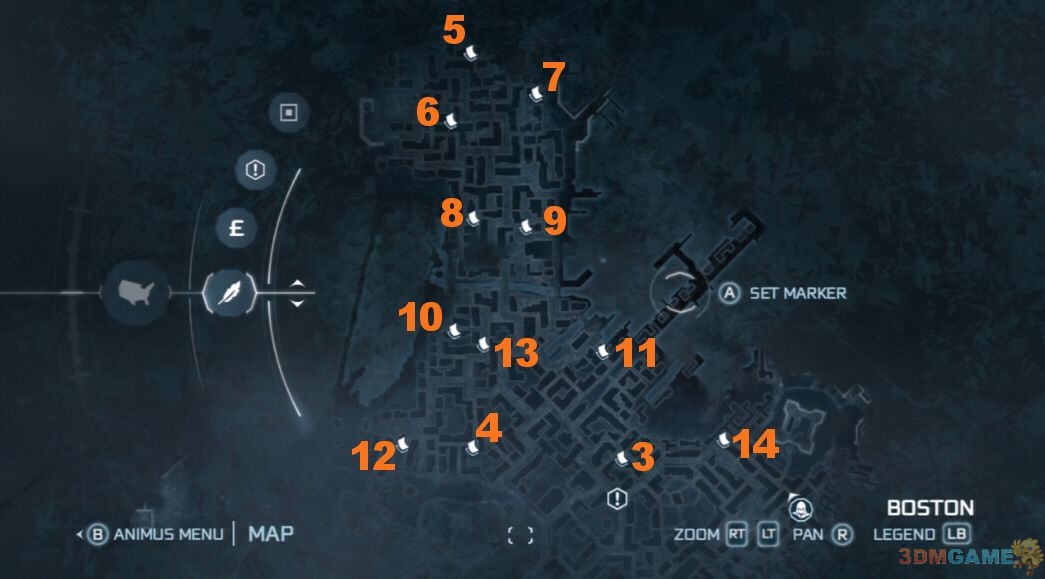 《刺客信条3》第二章富兰克林会要求海尔森寻找四张年鉴,有些用户不知道具体地点,这里我给玩家们找了出来,图上13~~16的位置就是。