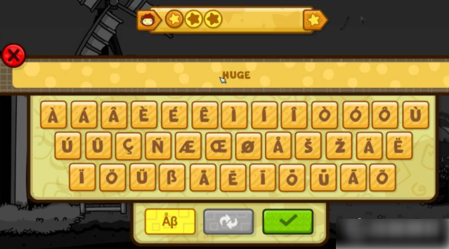 2.然后进入到我们的道具创造界面,道具创造主要是通过你输入相应的英文单词,从而游戏从其道具库中在你的该关卡界面创造出来相应的道具。输入界面用户无须按照游戏中的乱码键盘输入,直接用你的标准键盘进行英文输入相应的英文即可,输入框下有四个选单。第一个是切换到键盘,第二个则是调出之前输入的英文;第三个对话框图标则是一个比较重要的玄霄。该选单会依据你目前输入的单词,在游戏库中对应的英文相似栏列出列表让你选择。最后一个则是确认输入。