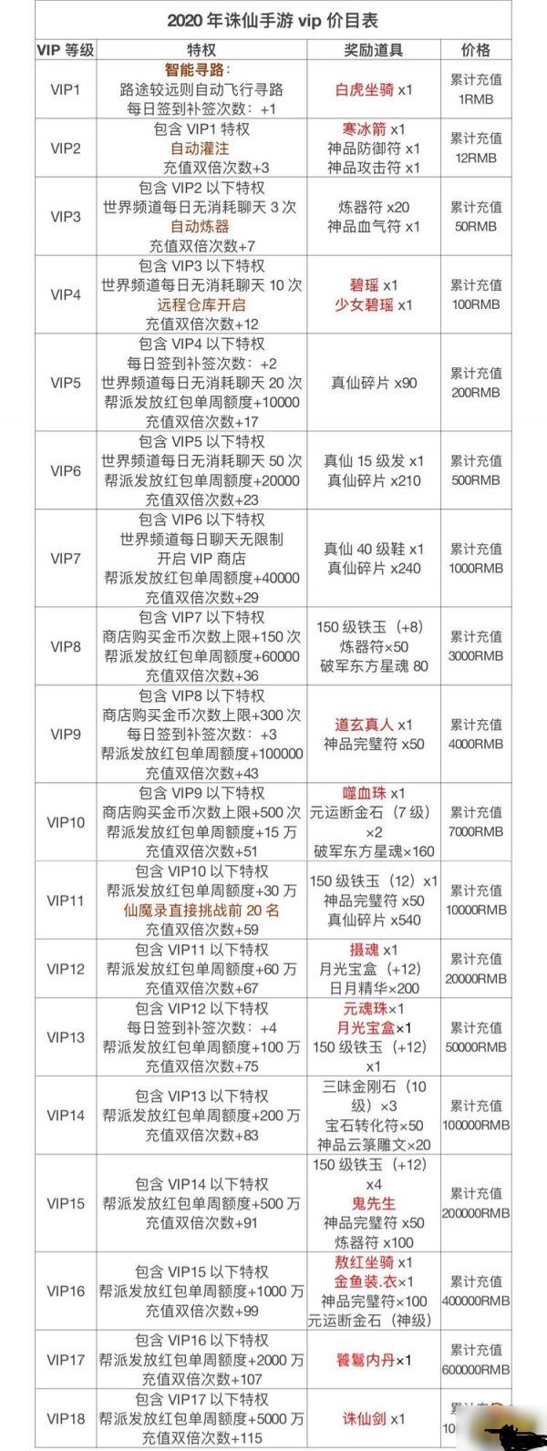 诛仙手游vip价格表一览: