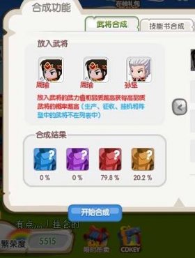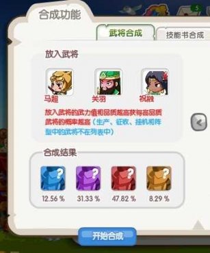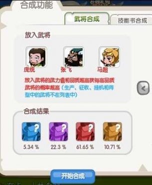概率小到合10次才能成功一次。但是用户放入的武将武力值和品质越高,合成高品质的武将概率也会越高
