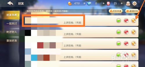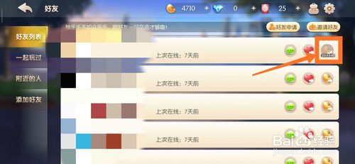 4.好友列表如下图所示,选择要赠送欢乐豆的好友,此处以方框处好友为例,点击右边箭头处的“欢乐豆”图标。