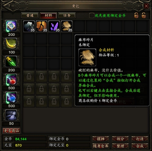 2、用户获取材料非常容易,在凄凉之地边境有四个采集点,用户用采集器分别可以采集到兽皮、麻布、精铁、魔法水晶的碎片。采集足够的碎片后用户自己合成,每5个碎片合成一个1材料,依次类推到,每个4级材料需要125个1级材料,合成界面在背包界面的右下角。