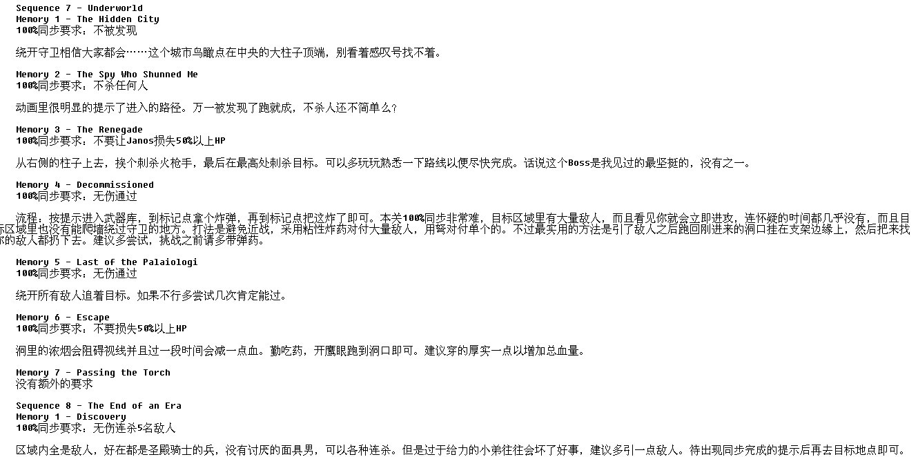 Memory 6 - The Yerebatan Cistern 100%同步要求:不要被发现。作为本作的第一个地下城,这个的同步要求个人认为是最难的。建议后期回来完成100%同步,进入前请带满各种弹药补给。在布满敌人的场景都可以躲到高处横梁上去,要点是保持距离,用远程武器和炸弹牵制或杀死敌人,粘性炸弹和弩都是不错的选择。同步难度较大请多次尝试。
