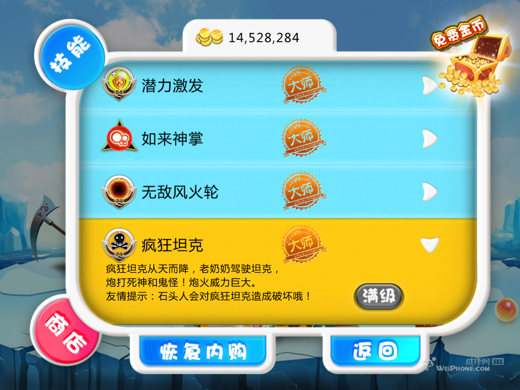 3.重新进入游戏,最好是之前就把后台清空然后重新进入,进入技能商城,发现所有技能都已经解锁,接下来玩家们要做的就是一个一个买下来,升级。最后玩家们就会看到下图这样的画面,恭喜你已经成功。