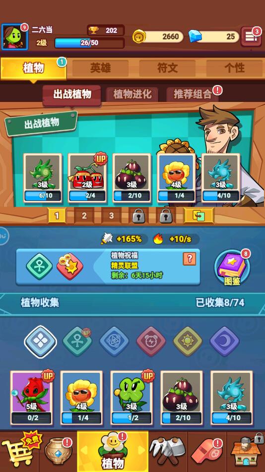 4、如下图,当收集到足够阳光时可以点击相应的植物来提升整体属性