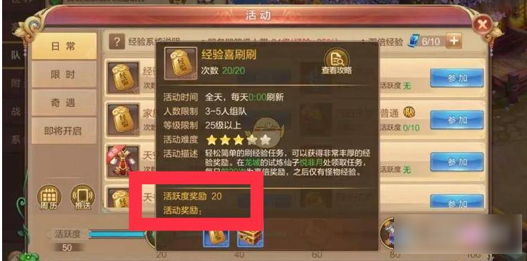 每日活动中,修罗战场的活动度奖励是最高的,可以从这里面获得活跃度,用户等级需要30级以上才能加入;镇妖除魔是每日必做的任务,完成后可以奖励10点活跃度,需要先将角色升到40级才能接。
