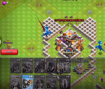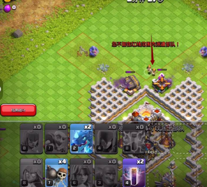 4、等蓝胖快要打掉圣水罐的时候放武神打掉两个防御建筑