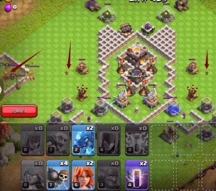 1、首先在资源罐的中间放两个超级弓箭手,随后在*下面放两个哥布林,两个女王