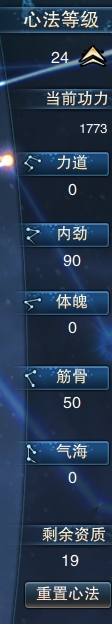 功力下面的5个基础属性可以看出你在哪些属性上面投入了多少资质点,也可以直接点击相应属性来打开穴位