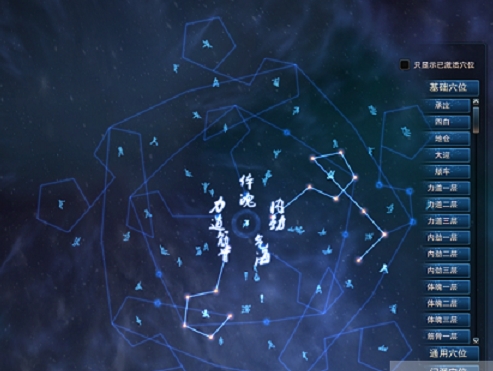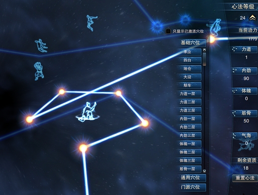 下面的是心法的全景图,亮着的就是你已经点开的穴位节点和穴位