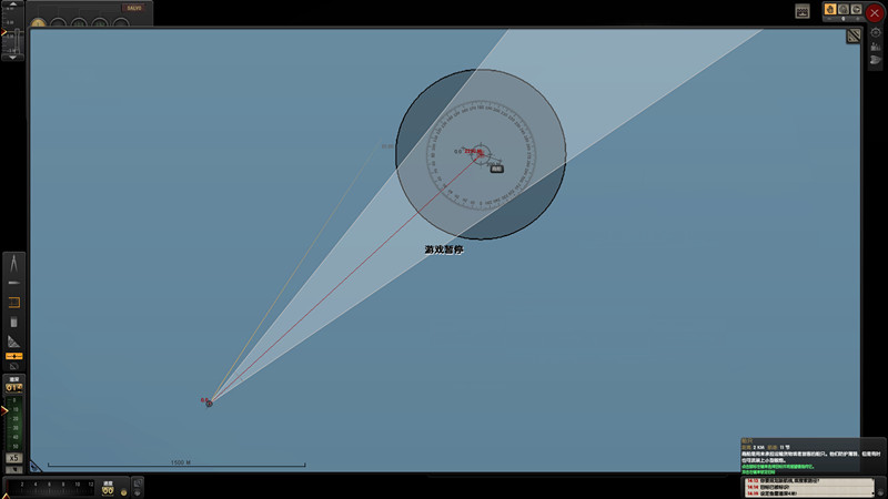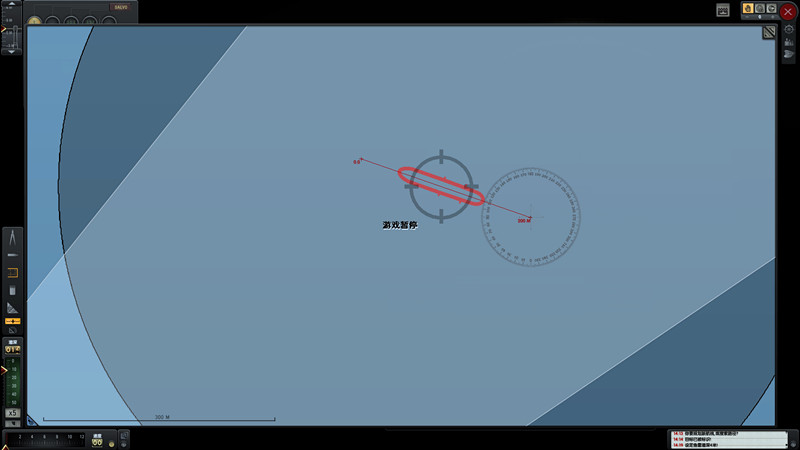 然后用攻击潜望镜对准目标船只所要攻击的部位,点击游戏暂停键,放大作战海图,作精确测量,(鼠标滚轴可以放大缩小海图目标)首先在目标船只上画一条预行航线,尽量画的准确些,否则影响测量船首角。