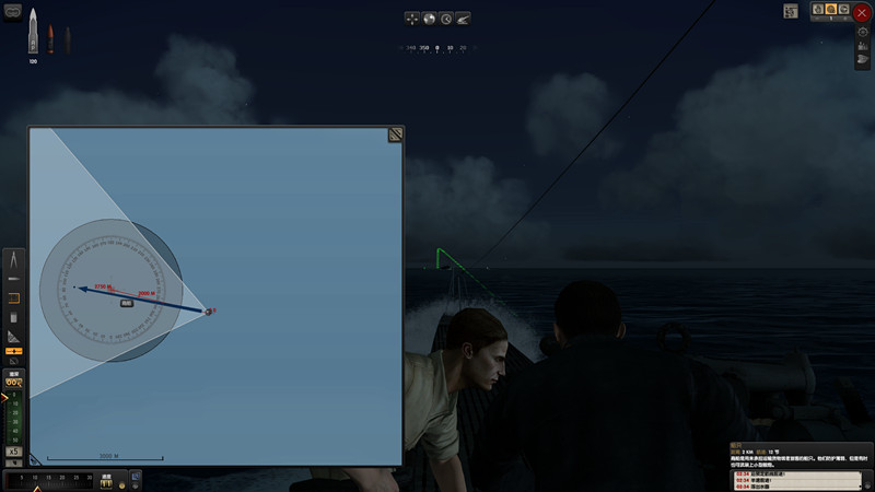 如图点击艇首88炮进入射击状态,然后开启作战海图,从潜艇到目标船只(T3西马诺级油轮)作条直线得到粗略距离数据。