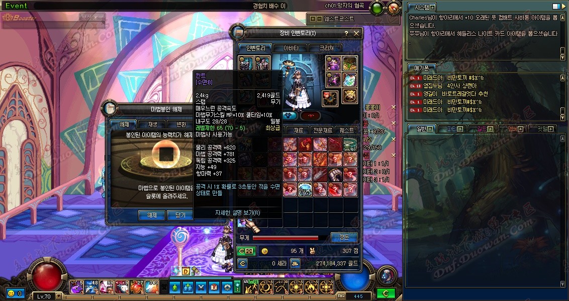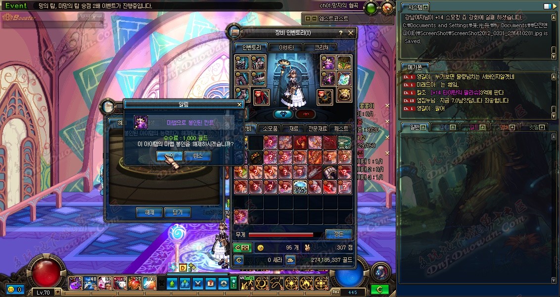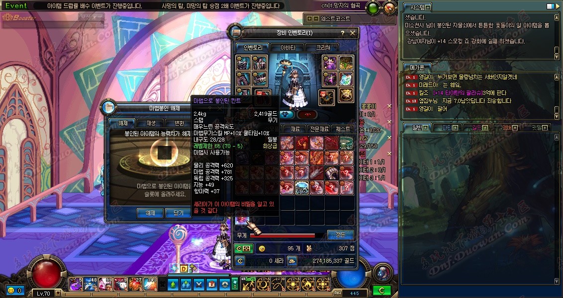 获得这种装备之后,可以找旅馆中的赛利亚花费一定数量的金币解除封印,金币数量并不是很多,70紫也才要1000金币而已