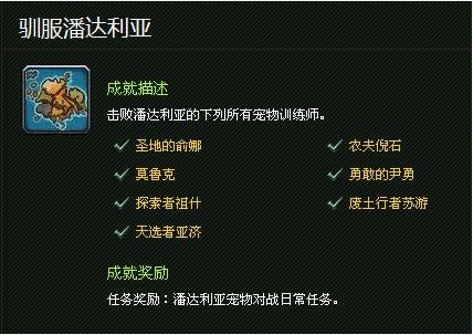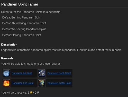 在5.1版本中,如果你的角色已经获得了“驯服潘达利亚”成就。将可以接到一个新的任务“熊猫人古灵训练师(Pandaren Spirit Tamer)”,任务要求你在宠物对战中击败所有潘达利亚古灵。奖励四选一,分别是熊猫人土灵、熊猫人风灵、熊猫人火灵和熊猫人水灵。